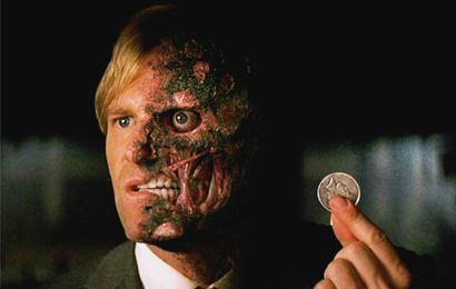 After The Joker’s warped plot to turn everyday citizens into murderers fails, he is captured by Batman, who then rushes off to witness his own personal hope for change lost on the vulnerabilities of flesh and blood. Two-Face blames a corrupt police force for the death of Rachel, and has taken revenge on those he deems responsible. Now his gun points at Jim Gordon and his family. In this tragic exchange, Dent sits at the human center of the iconic clash between the established hero Batman and decisive villain The Joker. Stricken with the potential for either law-abiding heroics or murderous rage, as Two-Face he stands for the whole of Gotham City. And therein dwells the poetry of Nolan’s narrative—that hero and villain vie for the soul of one man, whose presence as savior is seemingly representative of an entire city’s fate. Indeed, the duality of the core subject tears at the seams, strengthening the significance of the symbolic (and exciting) battle at the film’s forefront. But in stopping the corrupted Two-Face, Batman kills Dent and tragically destroys Gotham’s hope for a powerful human symbol. It is only by hiding how The Joker manipulated Dent into a killer and accepting the blame for Dent’s death that Batman becomes another kind of hero entirely: The Dark Knight of Gotham City, whose heroics require only that he supplies what the people of Gotham need, be it a hero or scapegoat.