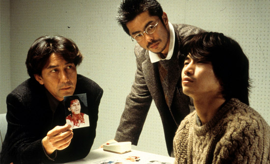 The film follows Kenichi Takabe (Koji Yakusho), a detective searching for the link between several unconnected victims with an “X” carved into their flesh. The latest involves a man who beats a prostitute to death with a pipe before slicing her across the chest and neck, as if saying, “X marks the spot.” But then the killer hides in a nearby storage closet, where Takabe finds him naked, huddled into a fetal position, with no memories, but weeping from the sudden awareness of what he’s done. Stranger still, there doesn’t appear to be one perpetrator behind the killings. Other victims with “X” carved into them have no connection to their assailants. A man obsessed with finding order in life and taught to suppress his emotions, the ever-logical Takabe is perplexed by a case that doesn’t fit the usual schema. “All I want is to find words that will explain the crimes,” he says. “That’s my job.” His friend, the police psychiatrist Sakuma (Tsuyoshi Ujiki), warns him not to look for logical explanations and questions whether crimes must have a purpose. “No one can understand what motivates a criminal,” Sakuma says, “sometimes not even the criminal.”