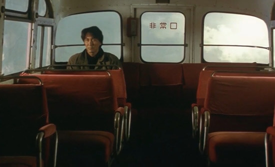 Kurosawa presents all of this in long master and medium shots that make the viewer an objective observer. He shoots scenes of gristly murder with the same distance he does Fumie and her doctor speaking. Another filmmaker might be compelled to stylize, and thus heighten, the violence for a greater impact. Kurosawa knows that depicting savage violence with a certain matter-of-factness, with less cinematic ornamentation, will have a more chilling effect. Then, without warning, Kurosawa breaks from his austere form to suggest that Takabe is not entirely immune to Mamiya’s ability to get into the heads of his victims. Flashes of animals from Mamiya’s apartment and a hallucination about Fumie’s suicide creep into Takabe’s mind. The aesthetic changes sharply to warp our expectations. We see the film’s long shots and measured editing interrupted by jarring images that cut into the film, reflecting Takabe’s susceptibility to hypnotic suggestion. From this point on, Cure remains in a state of duality between its beleaguered hero’s conscious and subconscious mind. Take a repeated shot that finds Takabe on a bus, where clouds, not buildings or pedestrians, stream by outside the windows. Does this image occur in reality from a strange angle? Or are we seeing Takabe travel between one frame of mind to the next, from a man troubled by his need for control to a man who embraces the chaos prescribed by Mamiya?