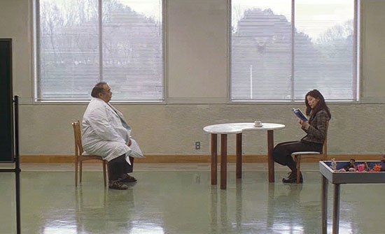 Takabe’s futile search for knowledge about Mamiya’s motivations or his wife’s illness echoes Kurosawa’s larger portrait of a dispassionate and disconnected society. Takabe admits to Sakuma that he’s been reading psychiatric texts to understand Fumie’s condition better, but it doesn’t help him get control. At home, Fumie continues to wander outside and turn on their dryer, absently performing these actions as if compelled by something deep in her mind he cannot understand. Worse, Takabe does not have the patience to try, not as the pressure of his case grows. Soon he must leave her with the equally detached doctor, who, in one session with Fumie, sits several feet away in a clinical room. The doctor’s method of therapy involves small talk of the lowest order. First, he asks Fumie about Bluebeard, then says, “Enough of the book, let’s talk about something else. How are you?” When Fumie responds with a short answer, he seems satisfied. With care like this, no wonder Fumie’s condition worsens. Such behavior is characteristic of Kurosawa’s ongoing critique of a disengaged culture—a theme he returns to in Pulse, symbolized by contemporary society’s overreliance on technology.