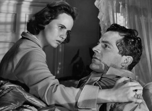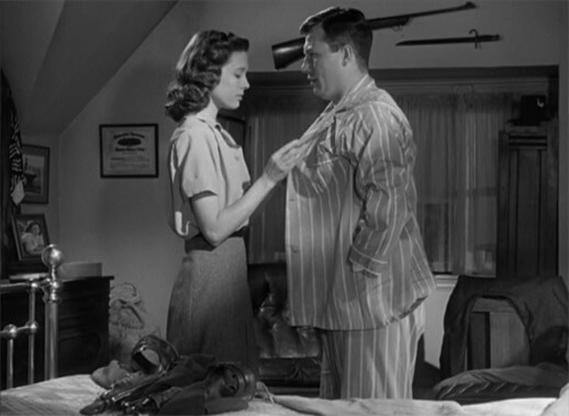 Homer’s entangled character alternates between feeling like a monster and a castrated man. In one sequence, a group of children watch Homer through a window, snickering and whispering about his hooks and his engagement to Wilma. His knee-jerk reaction feels like a true moment from an otherwise inexperienced actor. “Do you wanna see how the hooks work?” he shouts. “Do you wanna see the freak?” He smashes his hooks through the window, frightening the children. Elsewhere, Wyler included scenes where Homer lights a cigarette or plays piano with his hooks not to exploit the reality of Homer’s situation but to inform and normalize. The wounded soldier is not helpless; he can get around and function, yet people treat him and see him as infirmed. Homer’s story, based in part on Russell’s experiences, considers the psychological toll of such treatment. Those who behave toward Homer like a woeful case and refuse to accept his new hands prove more troublesome for Homer than living with his condition. It takes Homer revealing his nighttime routine to Wilma before he can trust that he will not hold her back or become a burden. He removes his hooks and the body harness that keeps them attached. “This is when I know I’m helpless,” he begins an openhearted speech. “My hands are down there on the bed. I can’t put them on again without calling to somebody for help. I can’t smoke a cigarette or read a book. If that door should blow shut, I can’t open it and get out of this room. I’m as dependent as a baby that doesn’t know how to get anything except to cry for it.” The scene required finesse and tenderness to meet all the demands of the Production Code, which rarely allowed for two unmarried young people to be together in a bedroom, much less one of them removing his pajama top and hooks. It remains a layered interaction, as film historian Sarah Kozloff notes that, under the surface, Homer worries he cannot fulfill the typical duties of a husband. The scene emphasizes how many veterans in Homer’s condition felt: unworthy of love compared to someone normal. Nonetheless, Wilma shows she is willing to try; she loves him, hands or no. Finally, Homer hugs her.