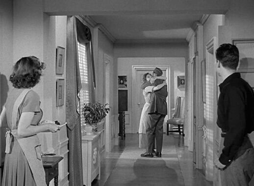 The Best Years of Our Lives marked the sixth and final collaboration between Wyler and Toland, who died in 1948. Together, they conceived a realistic aesthetic through a straightforward narrative, linear storytelling, modest camera movements, and deep focus photography—a far cry from the radical work Toland had done with Orson Welles. French theorist and critic André Bazin estimated that the film used only 190 shots per hour, about half of the average Hollywood film, due to Wyler’s insistence on long takes that immerse the viewer in the scene. Bazin’s study, one of the earliest to assess the film as Wyler’s masterpiece, argued that Wyler was not interested in emotional manipulation; he allows the viewer to see everything and make observations about what’s happening within in the frame. Bazin called Wyler’s approach an “invisible style” and noted that he makes it so “the spectator can (1) see everything; and (2) choose as he pleases. It’s an act of loyalty toward the spectator, an attempt at dramatic honesty.” Keeping the fore, middle, and background in focus enhances the effect, as does putting the action and reaction in the same shot, whereas a typical production might cut between them. Wyler’s deep focus staging is never more pronounced than in a bar scene where Homer and Butch play “Chopsticks” on the piano while Al watches. In the distance, Fred calls Peggy to tell her that he won’t see her again, a call that he promised to make at Al’s request. Al watches that too. Toland keeps all three figures in focus, and the scene parallels when the veterans sat at the same table in Butch’s earlier in the film, drinking together merrily, except now they are separated by spatial isolation and unspoken tension. Wyler’s interest in isolating his characters in visual terms led to his use of frames within frames: Al and Milly’s embrace at the end of a narrow hallway; Fred cramped in the bomber, reliving his trauma; Homer reuniting with his family from Al and Fred’s point of view through the cab window. Wyler understands that camera placement can involve the viewer by allowing us to search the scene and discover our own emotional reaction.
