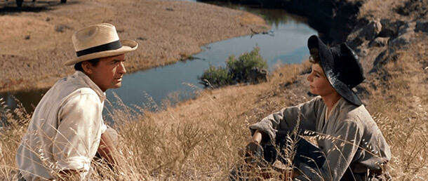 The Big Country’s rearrangement of classical Western themes remains subtle, stemming from the Terrill-Hannassey conflict and Jim McKay’s worldview. At first, Wyler’s film feels situated in a familiar setting where every “good morning” is answered with a “howdy,” and every “howdy” receives a “good morning.” Stories similar to the film’s central conflict between the Terrills and Hannasseys could, and have, been the foundation of countless Westerns about land disputes and family feuds. But in a more standardized setup, the backwoods Hannasseys would have been the villains and the modern Terrills would have been the heroes who bring civilization to the Wild West. Consider John Ford’s My Darling Clementine (1948), where the civilizing Earps run the rugged Clantons out of Tombstone, creating a safe place for the schoolmarm. Instead, both families in The Big Country, seen from Jim’s critical vantage point, a view marked by Peck’s expressions of quiet observation and silent judgment, have a limited perspective. The Terrills consider themselves morally superior, but their violent attacks—they ride into the Hannassey camp, invade their homes, scare off their horses, and shoot holes in their water supply—reveal hypocrisy in their selfish campaign to keep the Hannasseys away from the Big Muddy. Rufus Hannassey, though decidedly more honorable, answers the Major’s prompts with violence. Still, Rufus fails to control Buck, an unsavory bully and sexual predator who gives the Hannasseys a bad reputation. But as Jim observes, “This is nothing more than a personal feud between two selfish, ruthless, vicious old men”—notably, both stubborn, opinionated single fathers who raise contemptible children.