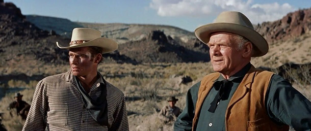 Though Wyler’s standing was enough to convince Heston to downgrade himself into a supporting role, regardless of solidifying his leading man status with The Ten Commandments (1956), Wyler’s directing style had a distinct reputation. Herman noted that he was thought to be “too slow, too deliberate, too careful, too demanding and, consequently, for tending to run over schedule and over budget.” Wyler was also known for demanding multiple takes of a given scene, earning him the nickname “40 Take Wyler,” much to the dismay of several actors. Bickford walked off the set in a huff, cursing all the way to his trailer after Wyler demanded nineteen takes of a particular scene. Wyler’s assistant director, Robert Swink, had to convince Bickford to return, at which point the director shot another eight takes. Shooting on location in the punishing heat, with few of the accommodations usually granted actors on the set of a Hollywood motion picture, certainly did not help matters. Simmons refused to discuss the production for years afterward. Baker clashed with Wyler and tried to tell him how directors are supposed to behave. Peck stomped off the set, abandoning the production for several days over an issue of reshoots. It’s inevitable that more than one historian has compared the mood on the set to the conflict between the Terrills and Hannasseys. In an interview about The Big Country, Ives suggested that Wyler used the uncomfortable situation to get the most out of performers. “Willy had all kinds of tricks to get that picture down.” But then, Ives and Heston were among the only cast members who got along with Wyler. “He was enigmatic sometimes,” Ives said, “but that’s what he did to make me figure things out.”