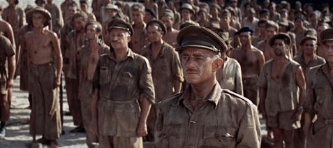 Saito’s paranoia and desperation, coupled with severe pettiness, reveals his madness early on. When he orders the officers gunned down after they refuse to work, it takes the British medical officer, Major Clipton (James Donald), intervening before Saito changes his mind. Later, Saito eagerly watches through binoculars as Clipton appeals to Nicholson, but then he quickly returns to a casual sitting position when his quarters are approached, so as not to seem fraught. Saito must always appear in control, always composed; every decision must be his. Though, his attempts at false confidence are transparent. Saito tries to bribe a starved Nicholson out of his stance by offering “English corned beef” and cigars at his table, which just so happens to have two place settings. Eventually, Saito has no choice but to release Nicholson, if only so the officers will prompt their men to better their efforts. When he finally gives in to Nicholson’s demands, he makes an excuse to announce the release of the officers, who will not have to work, claiming he came to the decision as a tribute to the end of the Japanese-Russian war in 1905. In a major victory, Nicholson returns to his men, who cheer their commander and raise him up, while Saito weeps for his loss of face.