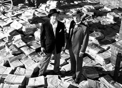 A wunderkind and innovator of stage and radio, Orson Welles and his Mercury Theater company caught the eyes of Hollywood after his infamous radio adaptation of H.G. Wells’ classic The War of the Worlds broadcast in 1938 in a series of false news bulletins about a Martian invasion. The entire broadcast, complete with faux commercials, music and all, was designed by Welles for maximum believability. When listeners panicked and ran for the hills (some didn’t emerge until weeks later), Welles’ talent was cemented in the public consciousness. Soon after, RKO president George Schaefer offered Welles an extraordinary contract that entitled the untested filmmaker complete control over direction, script, production, and final cut over two motion pictures. Moving to Hollywood, Welles began to develop several ideas that never materialized, including a first-person take on Joseph Conrad’s Heart of Darkness where the camera would replace the protagonist, and also a British thriller called The Smiler with the Knife. But these ideas were far too small and not controversial enough for the boy wonder who had frightened thousands of listeners with his radio broadcast. Welles and Herman J. Mankiewicz, an experienced screenwriter who entertained Welles with his tales of Hollywood’s early years, finally chose their subject when Welles discovered exhaustive notes for Mankiewicz’s unwritten book on Hearst. Mankiewicz had attended Hearst’s elaborate and star-studded parties as a Hollywood writer, and therefore had an inside view of Hearst’s life with his mistress, actress Marion Davies (Mankiewicz was friends with fellow screenwriter Charles Lederer, Davies’ nephew). For Welles, Hearst was ripe for exposure and, given the eventual script’s unabashed allusions to Hearst’s personal life, hidden behind the thin disguise of Charles Foster Kane, Welles was sure Hearst would retaliate. What he didn’t expect, however, was that the film would almost be destroyed in the process.