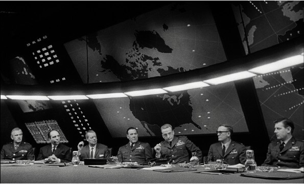 Visually, Kubrick’s subtle control over Gilbert Taylor’s cinematography brings out the layers of caricature and satirical human dimension given to the characters. Note how the director shoots Ripper from lower angles to imply his seeming authority, often in close-up to emphasize his larger-than-life personality. Hayden’s towering screen presence, cigar-chomping, and booming voice lend the character a warped gravitas. Similarly, the War Room becomes a dramatic space, not unlike the chateau where the French military leaders assemble in Paths of Glory to hatch their bureaucratic plans. To create the War Room, Kubrick relied on German-born set designer Ken Adam—who would later apply his talents to creating criminal lairs in the James Bond franchise—to create a setting that looks like a roulette wheel of chance. Adam even used green baize on the surface to look like a poker table (which is lost in the film’s black-and-white photography). And note how the “big board” of blinking lights on the world map bears similarities to a pinball machine. These flourishes imply how those in charge treat geopolitical concerns like an elaborate game. In a famous scene, President Muffley stops Turgidson from tackling the Russian ambassador (Peter Bull) by declaring, “Gentlemen, there’s no fighting in here—this is the War Room!” The line, already steeped in irony, becomes even more so when considered against the War Room’s design. What is more, all of this looked so convincing that when Ronald Reagan became President, he asked to see the War Room, and he was disappointed to discover no such place existed.