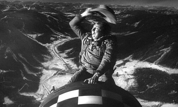 Ripper launches a nuclear offense because his male potency feels threatened, which is characteristic of Kubrick’s depiction of male insecurity as a source of potential danger in geopolitics. To be sure, Kubrick critiques the men who propel war, as scholar James Naremore observes: “Nuclear war is a hard-on for the men who wage it.” It’s amusing that few characters outside Mandrake and Muffley grasp the full gravity of the situation, and Sellers plays them both with effeminate characteristics. Overall, the film is populated by men more invested in bodies, namely their libidos, than the survival of the human race: Sex is never too far from Turgidson’s mind. In the middle of a War Room conference, Turgidson takes a call, whispering, “Look honey, I can’t talk now” and “of course it isn’t only physical,” before promising to join his secretary in bed just as soon as he can get away. Likewise, the B-52 crew distracts themselves with the latest issue of Playboy, and Dr. Strangelove entices the War Room officials with his calculation that there will be ten beautiful women for every man in his post-nuclear underground utopia. Each of these men is simple-minded in Kubrick’s hands, whether by their sexual preoccupations or interest in petty advantages. When Kong learns they’ll be dropping an H-bomb, he promises, “There’ll be some important promotions and citations” after they devastate Russia. Kong’s good-ole-boy perspective places promotion over any hint of solemnity about the lives he’s about to take. This leads to his famous yee-haw when, after another malfunction, he climbs aboard the bomb (hilariously stenciled, “Nuclear warhead. Handle with care”) to dislodge it, and he rodeo-rides it down to Earth—the film’s most iconic image.