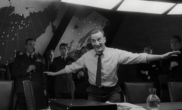 Andrew Walker observed, “Power politics has produced something worse than a Frankenstein monster—a logical monster.” And Kubrick worked closely with Sellers to bring the Strangelove monster to life, using Kahn’s warped logic, hints of lingering Nazism, and the single-gloved hand of the mad scientist Rotwang from Fritz Lang’s Metropolis (1927) as inspiration. Ever shifting in a wheelchair from his character’s internal battle between the U.S. advisor and the Nazi, Sellers delivers his performance with a German accent and a constant, creepy smile on Strangelove’s face. Answering Turgidson’s concerns about a “mineshaft gap” with the Soviets, Strangelove talks about raising livestock in the underground civilization that could be “bred and slaughtered,” and Sellers gives the latter word gleeful and unnerving emphasis. Such macabre allusions prompt an involuntary Sieg heil with his black-gloved right hand, operating with near autonomy from the rest of his body. This requires him to bite and beat the arm into submission—or, in an off-camera gag, stop it from fondling himself during his theories about the necessity for “prodigious” breeding and the end of the monogamous relationship. Finally, the promise of the world’s end excites Strangelove, prompting him to stand from his wheelchair. “My Führer,” he declares. “I can walk!” This final moment before the bombs destroy the world suggests Kubrick’s central theme that nothing could be so insane as rationality about nuclear war.