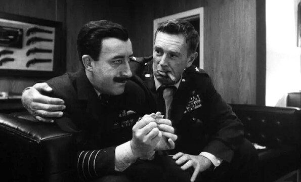 But it’s Peter Sellers who remains central to Dr. Strangelove. Then at the height of his fame after starring in Lolita and playing Inspector Clouseau in The Pink Panther (1963), Sellers brings three characters to life. Besides the titular mad scientist, his less showy roles are hilarious in their subtlety. Take Mandrake, the stuffy and mannered professional soldier who realizes that Ripper’s call for Condition Red isn’t an exercise—he responds to the threat of nuclear war with a resigned “Oh hell.” Mandrake’s stereotypical British soldier is too committed to order, politeness, and protocol to confront Ripper, though he could easily arrest or execute his superior officer if not for his manners. Elsewhere, President Merkin Muffley is one of the most logical men in the film, and his earnestness in the face of utter collapse reads as a kind of insanity in his willingness to debate silly semantics during his one-way conversation with the drunk Soviet Premier, Dimitri Kissov (as in kiss-off), who barely speaks English. This is arguably the film’s funniest sequence. Muffley talks to Kissov with all the forced patience of someone explaining an elaborate concept to a nincompoop: