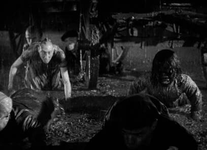 The screen story involves duplicitous trapeze artist Cleopatra (Olga Baclanova) seducing sideshow midget Hans (Earles) for his inheritance. Hans’ reluctant friends, the other sideshow attractions, resist allowing her into their clan, until Hans maintains her love is genuine. Finally they are married, and at the reception the freaks admit Cleopatra, chanting their ritualized initiation: “Gooble-goble, gooble-goble! …We accept her! …One of us, one of us!” Drunk at the ceremony, Cleopatra reveals her true feelings, insults the freaks, and tosses wine in their faces; her affair with strong man Hercules (Henry Victor) becomes apparent as they kiss in front of everyone. After, the lovelorn Hans remains with his new wife, though she slowly poisons him. Performer Venus (Leila Hyams) overhears Cleopatra expounding her plot to run away with Hans’ money after his death and tells the others. That rainy, storming night on the road, the freaks band together by Hans’ orders, crawling through the mud with knives in their mouths and weapons in their hands. They cut up Hercules and chase Cleopatra into the woods, reforming her body through mutilation into that of a “Human Duck”—her sideshow title, as a ringmaster informs onlookers in the last scene where Cleopatra is shown on display at the bottom of a pit, squawking and legless.