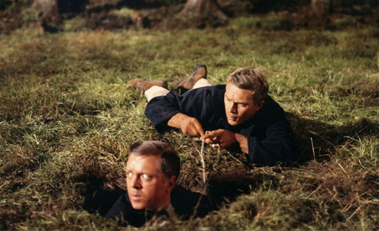 The film opens with trucks delivering a group of British and American soldiers into the Stalag Luft III, where the newly appointed camp Commandant, Colonel Von Luger (Hannes Messemer), tells the Group Captain Ramsey (James Donald), “There will be no escapes from this camp.” The Nazis have assembled a who’s who of POW escape artists. “We have, in effect, put all our eggs in one basket,” says the Commandant. “And we intend to watch this basket carefully.” Nevertheless, the POWs refuse to submit and quietly wait out the war. Bartlett (Richard Attenborough), the head of the prisoners and codenamed Big X, considers it his duty to “harass, confound, and confuse the enemy to the best of my ability.” He announces a scheme to embarrass the Nazis by carrying out the most elaborate escape plan in history. Although the impatient Captain Hilts (McQueen) has his own, more immediate plans, Big X arranges for hundreds of forged documents, civilian clothing, distractions galore, and not one but three separate tunnels—named “Tom,” “Dick,” and “Harry.” Regardless of the extensive planning, when the time comes, their efforts are discovered. The daring race to a neutral border is breathless and futile since only three men evade their Nazi pursuers. Even so, those captured and murdered by the Nazis are remembered, and the POWs resolve to continue their escape attempts.