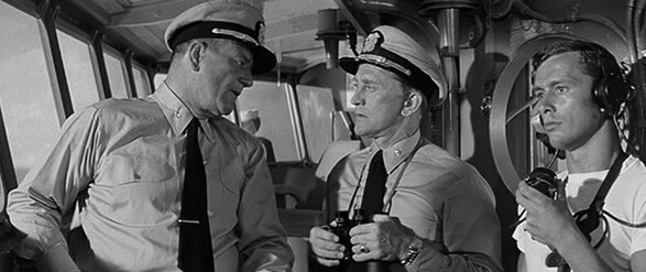 The production looks impressive for much of the picture. Cinematographer Loyal Griggs, who received the film’s only Oscar nomination, shoots in black-and-white on Panavision cameras, lending an epic visual treatment. Preminger had the support of the US Defense Department for the use of ships, planes, cruisers, and even transportation—the cast and crew traveled from Seattle to Hawaii aboard the USS St. Paul, on which Preminger shot a number of authentic-looking scenes. Those scenes appear genuine and impressive in scope, even today. The Pearl Harbor sequence in the opening employs a minimum of Hollywood artifice; instead, the audience sees real people interacting with real equipment, and those are real Japanese planes flying overhead, and real explosions, both of buildings and in the water. Despite the incredible pyrotechnics on display, the sequence hardly captures the scope of loss. Showing the full damage of the attack would be too much for Americans rooted in their postwar patriotism. Less impressive are the later battles, including a submarine attack that employs miniatures in studio water tanks, or the rear-projection shots used in the final, chaotic shootout between battleships, which also uses stock footage and obvious scale models.