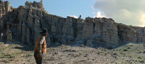 Mann’s approach was distrustful toward the romantic, sweeping views of the West attributed to idealist filmmaker John Ford (My Darling Clementine (1949) and The Searchers (1956)). Ford set his stories against landscapes and often considered his narrative secondary to the overriding environment; something greater, be it God or America or Manifest Destiny, exists in Ford’s landscapes, and at times that intangible element is unclear in Ford’s pictures. Meanwhile, Mann often suggests an alternate Western environment where, without his narrative arc and the insights of his camera, hero and villain would otherwise be too close to call until the final frames. Combining images and ideas into a whole body, Mann unites formal technique and narrative into a single living, breathing individual. His landscapes are not worlds unto themselves; through their use, we better understand the characters occupying their space, like a conceptual-philosophical device. Whereas Ford’s are occasionally overwhelming places where characters disappear into the beauty and sometimes frightening vastness of the West.