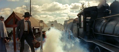 Link’s Old West criminal history has been masked by his newfound home in Good Hope, his sins confessed to and forgiven by his wife and fellow citizens. Indeed, they trust him with the town’s savings as he travels to Fort Worth to hire their first schoolteacher. But Mann never shows us Link’s spiritual haven, since his film develops into a tale about The Death of the Old West. Instead, Link is disconnected from his asylum on the train, which sends him crashing back into the horrors of his past. The train enters the station sounding its whistle and wafting steam from below. Link, having never seen such a train before, takes a few shocked steps back. “That’s the ugliest thing I ever saw in my life,” he says. Once boarded, Link takes an open seat and Cooper’s long legs supply a humorous, symbolic moment when the train’s squashed compartments prove too small to contain this Man of the Old West, forcing him to sit to the side. Representative of the losing battle of the untamed frontier against the ongoing civilizing process spreading from the East, Link surrenders to the train, existing as both a member of the New West and the Old West uncomfortably cramped into a single slot.