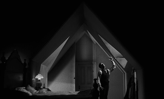 Each dynamic set-piece keeps the audience on edge. Scene after scene, the sets present a playful exchange of styles, forcing viewers to ask how the filmmakers created this unnatural storybook. Cortes shot many of the interiors in the style of German Expressionists, casting grave shadows with sharp angles and high contrasts. He shot exterior scenes with the dreaminess of a rural haven inspired by Griffith. The cellar where Preacher tries to capture the children and the A-framed bedroom where he kills Willa were detached set pieces, made small to suggest a claustrophobic and deadly environment. What is more, Cortes frames the rooms in pitch darkness for dramatic effect, sometimes relying on no more than a single candle as a light source. The same sets could have been placed on a stage had The Night of the Hunter been a Laughton theater production. In the former example, the surrounding black of the cellar isolates the children with the approaching Preacher; in the latter, the A-framed bedroom suggests a cathedral space that has become holy with the Preacher’s presence—certainly no place for a husband and wife to engage in “dirty” acts.
