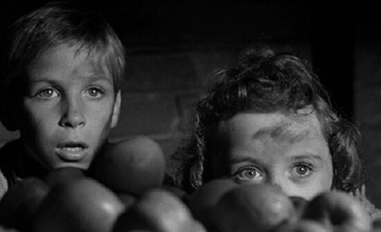 Laughton also hand-picked his crew to support a production grounded by artistic collaboration. Many historians attribute Laughton’s allowances of creative freedom to his lack of technical expertise as a film director; he knew what he wanted to see on the screen, just not how to manufacture it. Cinematographer Stanley Cortez shot The Magnificent Ambersons (1942) for Orson Welles; although, the classicized style of that film was a complete contrast from the theatrical staging and chiaroscuro light he uses in The Night of the Hunter, both testaments to Cortez’s versatility within his craft. Composer Walter Schumann was given unique freedom as a composer when Laughton demanded that his score not re-emphasize what the actors should already be conveying; rather, Laughton instructed him to build on the power of the narrative by affixing an additional layer. Since Laughton the Actor came with a reputation for being difficult and demanding, if not ruthlessly committed to his artistic ideals, the collaborative atmosphere he created on set was unprecedented in his career. He was noted for shouting out, “What do I do now” or “I’m confused,” yet he was also the undisputed leader on set, a democratic captain ever open to ideas. He may not have been able to articulate in filmic technical terminology what he had wanted before filming had begun, but when it was over, The Night of the Hunter was just as Laughton had envisioned.