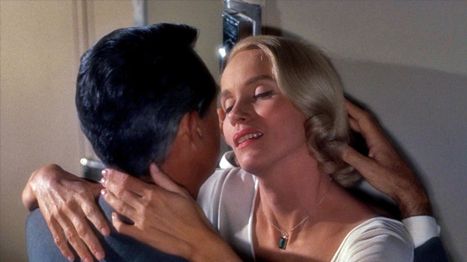 In their scenes together on the train to Chicago, Grant and Saint share delightful passages of Lehman’s clever, sexy dialogue. Seated across from each other in the dining car, the conversation quickly moves into a playful exchange of innuendo. “I tipped the steward five dollars to seat you here if you should come in,” Eve tells him. “Is that a proposition?” Thornhill asks. She declares, “I never discuss love on an empty stomach.” “You’ve already eaten.” “But you haven’t.” The audience loses themselves in this romantic banter, forgiving how easily these strangers leap into each other’s arms, certainly not suspecting Eve’s double-cross yet. Allowing the fugitive Thornhill into her compartment where they become close, Eve asks, “How do I know you aren’t a murderer?” “You don’t,” he replies. “Maybe you’re planning to murder me right here, tonight,” she suggests. “Shall I?” “Please do.” And then they kiss. This scene mirrors the one in Notorious between Grant and Ingrid Bergman, what was then called the longest screen kiss ever put on film, yet the dialogue in that scene breaks up a dozen smaller kisses, just like this one. Lehman, the writer of Sabrina (1954) and Sweet Smell of Success (1957), layers every scene with double meanings and suggestive overtones; dissecting it proves just as thrilling as the spy-themed suspense.