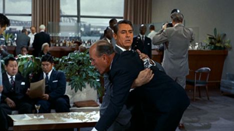 However, Grant raised questions about his role in the film after signing—a trend that Hitchcock had become accustomed to over their many collaborations. Ever since Suspicion (1941), the film where Grant signed on to play a murderer but was rewritten into a misunderstood gambler, the actor had doubts about working with the director. But Hitchcock knew the easiest way to overcome Grant’s protests was to ignore them. He did just that, and they subsided. Grant’s relationship with Hitchcock had always been rocky, but not problematically so; it never prevented them from having a productive relationship. Availability and budget restraints often foiled their potential collaborations, but Hitchcock always envisioned his leading men with Cary Grant in mind—an attractive, well-dressed, and quick-witted hero who is desirable to beautiful women and nimble enough to outsmart the opposition. Despite Hitchcock’s high regard for Grant, the two only collaborated on four pictures, including Notorious and To Catch a Thief (1955). And so, while Grant remained baffled by Lehman’s improbable scenario, criticizing the lack of logic from scene to scene, Hitchcock wanted Grant that way—it reflected how the bewildered Thornhill should feel wrapped up in a tangled web of spies.