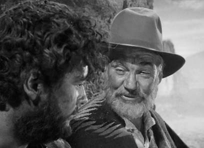 Indeed, Bogart plays one of cinema’s most contemptible, selfish, and paranoid characters. Dobbs is unpleasant and hostile from the film’s first scenes when a lottery boy keeps asking him to purchase a ticket and lowers the price each time, until Dobbs tosses a drink in the child’s face. Of course, he eventually buys the ticket to silence the boy, but only after humiliating him; even worse, the ticket is a winner. Dobbs is a clashing character, at times willing to share his earnings, such as the lottery winnings he shares with Curtin to stake their excursion. Later, Dobbs uses that very fact in a power play, holding his contribution over the heads of his two partners. Dobbs is also competitive and petty, early on boasting about how many bandits he killed during a train raid—though their leader, known as Gold Hat (Alfonso Bedoya), gets away—as though it was important to either Curtin or Howard how many lives each of them took. Self-obsessed, Dobbs desperately wants approval, respect, and to get an edge, perhaps because an edge has long eluded him. When the three strike gold, Dobbs is the first to propose they cut up their findings as they go, as opposed to after the entire dig—to make each man responsible for his cut. And though he claimed $25,000 would be enough to live on, later he calls it “small potatoes.” Soon, he takes to checking his stash in the middle of the night and muttering to himself in fits of paranoia—things like, “Won’t catch me sleeping” and “I’ll let you have it”. Howard, never one to mince words or mutter, tells him, “Got somethin’ up yer nose? Blow it out, it’ll do you good.”