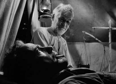 A pathetic vagabond scouring Tampico in 1925, Fred C. Dobbs (Bogart) has no apparent past and no certain future. He asks for handouts (“Say, buddy. Will you stake a fellow American to a meal?”), plays the numbers, picks up half-smoked cigarette butts from the ground, and believes in getting rich quick and spending his earnings even quicker. After trying everything to make his fortune, his next attempt will be no different. Along with a fellow drifter from the states, Bob Curtin (Tim Holt), Dobbs takes a job toiling in the hot sun for a crooked employer, Pat McCormick (Barton MacLane), who tries to skip town instead of paying his workers. When Dobbs and Curtin corner him about their pay, the ensuing bar fight illustrates just how pathetic Huston’s characters are. They deliver one ineffectual blow after another to McCormick, who is by no means an impressive physical specimen; and yet, our heroes are so feeble that it takes them both to punch out McCormick. With money in hand and good reason to leave Tampico behind, they look up Howard (Walter Huston), an old man who—earlier at the Hotel Oso Negro, a shelter comprised of beds in a large, filthy room—talked about his days as a prospector. Howard agrees to show them how to prospect for gold, and Dobbs agrees to be equal partners with Curtin. They shake on it, and the camera moves in on Howard’s face between them, showing uncertainty and skepticism over a partnership between two weak men.