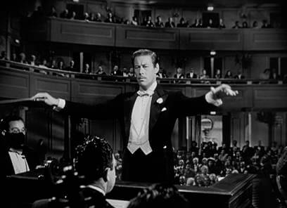 Harrison plays world-famous conductor Sir Alfred de Carter, who arrives home from England with a warm greeting from his much younger, beautiful wife, Daphne (Linda Darnell). But his brother-in-law August (Rudy Vallee) has troubling news. August misunderstood Sir Alfred’s orders to look after his wife, and in turn hired a private investigator to watch Daphne while Sir Alfred was away. Sir Alfred, prejudiced again private detectives, is outraged at the thought of flatfoots following his beloved wife. But he soon learns that Daphne made a late-night trip to the hotel room of Sir Alfred’s assistant, Tony (Kurt Kreuger), a good-looking man of her own age. Now convinced Daphne and Tony are having an affair, Sir Alfred takes the stage to conduct his first of three selections, the lively overture to Rossini’s Semiramide, and while waving his wand he imagines killing Daphne and framing Tony for the murder. He conceives himself recording and manipulating his voice to sound like a woman screaming for help; then he proposes that Daphne should call Tony to take her dancing, if only to draw Tony into their room. His fantasy continues when Sir Alfred imagines slashing Daphne to death with his razor, and once Tony arrives to pick Daphne up, the conductor has arranged it so Tony is arrested once the screaming woman recording alerts authorities. As Tony is sentenced to execution for murder, Sir Alfred imagines himself laughing like a madman in the courtroom. Sir Alfred’s next daydream comes after a break in the concert, when he conducts a somber selection from Wagner’s Tannhäuser, to which he sees himself humble and forgiving—in his musing, he even writes Daphne a check and admits quite selflessly, “Youth belongs to youth.” For his last performance, Sir Alfred conducts Tchaikovsky’s Francesca da Rimini; at the same time, he sees himself forcing Daphne and Tony into a game of Russian roulette, the first shot of which tragically enters Sir Alfred’s head.