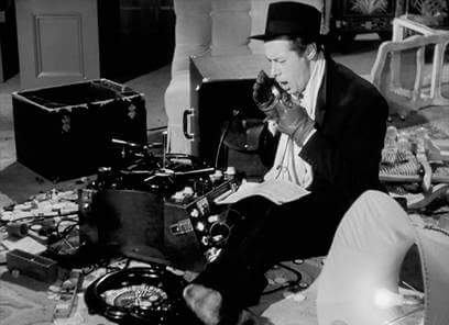 Once he completes his concert, Sir Alfred rushes home to prepare Daphne and Tony’s demise, but without the music to guide him, he bungles through each of his three ill-conceived plots. He tries to find his vinyl “home recording unit” to record the screaming voice that will alert authorities, but in the process, he nearly trashes his entire room looking for it—crashing over furniture, breaking lamps, and stepping on light bulbs. He’s hardly the suave killer he imagined himself to be. Once he finds the cumbersome box tucked away in a closet, he struggles to understand its instructions, which frustratingly read “So Simple It Operates Itself”. Before he can finish, Daphne arrives home, baffled at her husband’s unruly and unexplained behavior throughout the evening. Sir Alfred tries to convince Daphne to go dancing with Tony, but she’s not interested; Tony is a terrible dancer, she explains. After all, there is no affair; Sir Alfred followed “circumstantial” evidence and his own insecurities to the worst possible conclusion. His love for her is so strong, while his own ego is so fragile, that the mere thought of betrayal has sent him spiraling out of control. As he tries to carry out his second fantasy—where he behaves nobly and writes her a check—he instead remains irritable, petty, and graceless, spilling ink all over his checkbook. Finally, he cannot find bullets for his gun, which means he will not be playing Russian roulette either. At last, Daphne explains beyond any doubt the misunderstanding in the private eye’s report, and she writes off Alfred’s base assumptions as a natural part of an artist’s great, consumed mind. Sir Alfred puts aside his suspicions and insecurities about his age, and he announces that tonight the two of them will dress vulgar, drink magnums of champagne, and go dancing.