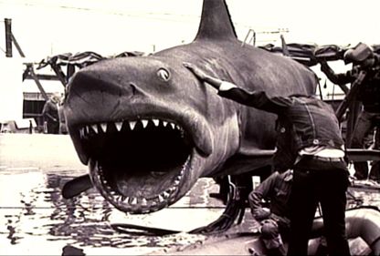 Indeed, Hitchcock defined cinematic suspense as an inconsequential conversation at a table. As the mundane conversation between characters proceeds, the filmmaker shows the audience a bomb under the table ticking down with five minutes to go on the counter. All at once, this routine conversation becomes unbearable for the audience as the participants jabber away without a clue. The opposite of such suspense would be a shock, where the audience is unaware of a bomb and suddenly it goes off. In Hitchcockian terms, Spielberg shows us the time bomb ticking under the table early on with Chrissie’s death, and as his picture proceeds, the ticking continues and slowly makes us writhe in our seats, until the film’s final hunt in the third act when the bomb seems to explode from the water onto the stern of Quint’s boat. Better even, Spielberg introduces the shark without showing us the shark. The director’s evident mastery of this approach, necessitated by his troubled production, allows for our imaginations to run wild. The famous opening employs those underwater POV shots and John Williams’ iconic two-note theme to establish the shark character; in subsequent scenes, the theme needs only to pulsate to instill our fear. Later, the appearance of a fin, the reaction of a witness, the presence of a tooth left behind, or the reappearance of the yellow barrels Quint has harpooned into the shark reinforce our terror without actually showing us the bomb’s wires and dynamite. When the shark finally does appear, our imaginations have filled in the blanks otherwise left gaping by the production’s prop shark, an awkward foam thing that caused countless hours of wasted fumbling on-set. Seeing behind-the-scenes photos and footage highlights what an effective filmmaker Spielberg must be to implant such terror from a shoddy assemblage of wire and neoprene and mechanical moving parts.