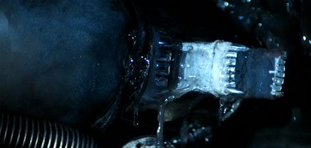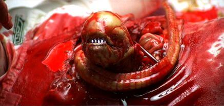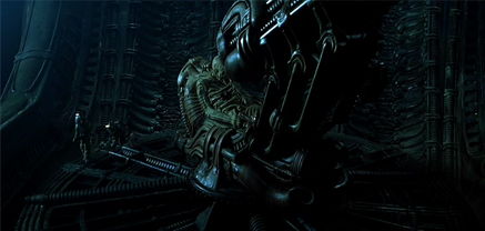 But these are just physical qualities. Violent psychosexual connotations go further to instill terror and unease, as the victim’s participation in the alien life cycle amounts to non-consensual reproduction or rape. As a conscious reaction to the horror genre’s trend of using women as rape victims or damsels in distress, O’Bannon and Shusett wanted a creature that would create untold fear in male audiences and empower their leading protagonist, a woman. Even in his alien paintings, Giger’s often sexually explicit art contains redolent sexual symbols, and there was an intended effort on the part of the filmmakers to implant such discomfort in male viewers. Leaping from a vaginal egg whose opening was conceived by Giger to appear like an X-shaped vulva, the Facehugger’s process of impregnation commits an oral invasion into Kane, who is then subject to sexual reassignment as he becomes the mother of the penile Chestburster. Ash later whispers, “Kane’s son.” The phallic associations are many, not the least of which is the grown alien’s tube-like head, designed by Giger to resemble a penis. The creature’s lips, dripping with sexual lubricant used by the filmmakers to simulate alien saliva, spread to reveal vagina dentata teeth and jaws that open to unleash a phallic double-jaw. When the alien’s jaw slowly emerges in the finale, the extension is cut against a scantily clad Ripley, and the edited association brings to mind a forming and dripping erection, fuelling eroticism into a tense horror scene. Opposing male and female sexual allusions stimulate our sense of confusion about a monster whose onscreen presence was intended to implant a fearsome sexual identity crisis from our momentary glimpses.