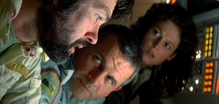 Scott’s moody treatment of the plot is counterbalanced by his talented ensemble, who gives the film an unmistakable human dimension in the coldness of space. Wage slaves all, the Nostromo’s crewmembers behave like interstellar working stiffs, led by their mellow captain, Dallas (Tom Skerritt). Second in command is the good-humored Kane (John Hurt), host to the alien organism. Next in line is warrant officer Ripley, who tries to quarantine Kane, but her adherence to protocol is defied by the icy science officer, Ash (Ian Holm), who allows Kane onboard. On the sidelines and informing the audience’s reactions are edgy navigator Lambert (Veronica Cartwright), and maintenance men Parker (Yaphet Kotto) and Brett (Harry Dean Stanton), who quibble tirelessly about getting paid less than their fellow crew members. Most impressive is that the youngest actor among them is Cartwright at 29. If Alien were made today by another filmmaker, it may have been populated by the time’s youngest and hottest stars. Scott’s intention, however, was to find a cast that could bring natural performances to an unnatural setting, and these actors lend the picture that needed texture of humanity and everyday behavior. For the film’s startling and bloody chestbuster scene, the director and Hurt prepared without telling the other actors just how it would play out; this now iconic movie moment features improvised yet natural reactions from actors shocked by the amount of fake blood spurting from Hurt’s body, but also from his jarring physical performance.