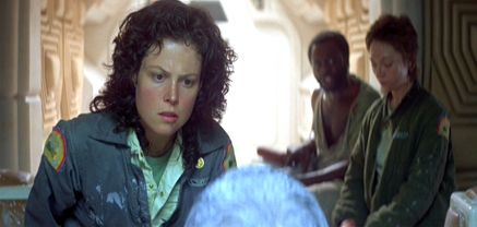 Because the performances seem so natural, the film disarms the audience and waylays us when Ash is revealed to be an android, embedded into the crew’s ranks to execute orders given by the Weyland-Utani Corporation, the crew’s employers and this series’ enduring evil empire. After Dallas has disappeared during his attempt to locate the alien, and with Kane dead, Ripley is left in charge and wants answers from Mother. Mother’s responses are cryptic and cite “Special Order 973” as a company directive that places highest priority on returning the alien organism intact—crew expendable—to study and somehow turn it into a bio-weapon. At once, the terror swells as Ash corners Ripley to seize control and silence her by forcing a rolled-up magazine down her throat. Parker and Lambert stop him, and during their attack they expose Ash’s milky synthetic insides; they are as shocked as we are to learn what Ash is, and how their situation has gone from bad to worse. All but decapitated, Ash’s head is mounted on a table and rewired so the remaining crew can get answers. With cold, smug superiority, he drones on about the alien’s qualities, “I admire its purity. A survivor. Unclouded by conscience, remorse, or delusions of morality… I can’t lie to you about your chances, but… you have my sympathies.” Not only has the alien fright terrified the audience, but now we are stricken with corporate paranoia, which in turn layers the scenario from a simple alien body count movie into one that heightens our feelings of tension and isolation in the loneliness of space.