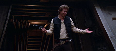Michael Kaminski’s book The Secret History of Star Wars notes, “Lucasfilm press material would later state… he had all nine episodes written out and that he merely picked the fourth entry… But the only script Lucas had was Star Wars, a single, stand-alone film, with various early drafts that did not contain the plots for the additional episodes.” How else can one explain the incongruities between A New Hope and Return of the Jedi, or the awkward resolution of Luke learning that Vader is his father, and then confronting Obi-Wan about what he was originally told? Obi-Wan explains, “What I told you is true… from a certain point of view.” And in response, Hamill takes a tone that seems to exemplify the feelings of the audience, echoing with disbelief, “‘From a certain point of view’?” Elsewhere, Return of the Jedi makes quick work of interesting characters. Fans of Boba Fett find no solace in his slapdash demise: he’s accidentally struck by Han and sent falling into the mouth of a desert beast with a pathetic cry. But these observations are not to suggest the film is irredeemable; they simply take what could have been a fascinating saga and truncate it. The result entertains, particularly the Jabba’s palace sequence and the scenes on Endor (however cutesy they may be). The Rebel raid on the Death Star showcases impressive visuals; and the mood of the scene between Luke, Vader, and the Emperor remains tense.