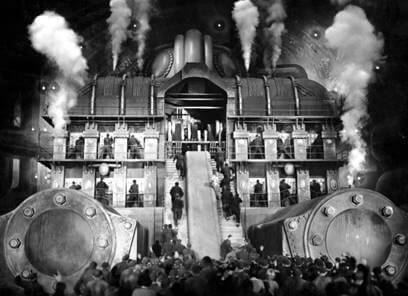 But if the restoration has confirmed anything beyond the visual force of Lang’s film, it has reinforced the notion that the story of Metropolis is trivial, confused, and illogical no matter the cut being viewed. In a scathing but incisive review published in the New York Times in April 1927, science-fiction author H.G. Wells (The War of the Worlds, The Time Machine) summed up the film and its implausible predictions about the future nicely, writing, “It gives in one eddying concentration almost every possible foolishness, cliché, platitude, and muddlement about mechanical progress and progress in general served up with a sauce of sentimentality that is all its own.” To be sure, Wells’ discussion about the “muddlement” of the machines and progress is difficult to discount, as it tears down any hope for logic or meaningful sociopolitical commentary in Metropolis. Consider how laborers in the film toil away to maintain a city where the middle-class, political presence, and civil servants are unseen or nonexistent. Who else but the labor class and upper crust inhabits this city? And why must the laborers waste away on ostensibly nonfunctional machines? Wells observed, “Much stress is laid on the fact that the workers are spiritless, hopeless drudges… But a mechanical civilization has no use for mere drudges; the more efficient its machinery the less need there is for the quasi-mechanical minder.” Wells does not see a benefit from the intense labor depicted in the film, and so he wonders what the labor produces, if anything, and for whom? Lang later admitted to interviewer Peter Bogdonovich that the central, simple-minded theme of the picture was “unrealistic” and “a fairy tale” and conceded, “I was very interested in machines.” Lang’s fascination does not extend beyond the machines themselves, their daunting beauty, sharp lines, and imposing stature within his frame. He does not intentionally intellectualize the machines, and therefore they are empty components of the narrative. (Wells said of the narrative, “Originality there is none. Independent thought, none.”)