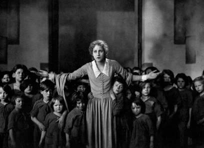 For the flooding sequence, Lang rounded up hundreds of slum kids from around Berlin and forced them into cold water for nearly two weeks of shooting; their torment was offset by regular doses of warm meals, toys, and cocoa. For the adult extras, Lang benefited from Berlin’s high unemployment rates when he needed to film a dream sequence where half-naked men leap into the mouth of Moloch, god of fire, as imagined by Freder when he first sees the Heart Machine. Though the sequence appears swelteringly hot in the film, in reality, the set was freezing cold and filled with smoke, and the steam from the smoke created a chilly drizzle that fell onto the heads of shivering, hungry, skinny, jobless men. Lang’s cruel orchestration of his picture culminated during the filming of the Heart Machine’s destruction, where the puppeteer-director literally dangled his extras from strings to create the impression that they were blown away from the machine. It wasn’t all freezing temperatures; for Maria’s retelling of the Tower of Babel legend, Lang required 1,000 extras to shave their heads and drag huge actual stones through an actual desert landscape. Between shots, the extras could do nothing but wait around and get horribly sunburned. The cast and crew whispered about Lang’s “abnormal” approach and demands, believing him nearly murderous. When Lang’s methods caused the production to be over-schedule and over-budget, Pommer, who was the voice of reason on-set, was blamed by the studio, and so Lang was free to continue unhindered. One of the last, most dangerous sequences entailed burning robo-Maria at the stake, and Lang insisted Helm experience the heat of real flames for authenticity; while filming the scene, Helm’s dress caught fire and, after being rescued by Lang and the on-set fire department, she passed out in Lang’s arms.
