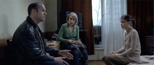 Though Mungiu’s film grammar has been said to eliminate “the possibility of visual commentary,” 4 Months, 3 Weeks and 2 Days is not without its more expressive touches that underscore the fish tank quality of the film. Mutu’s camera may be handheld, but it often settles back into stationary scenes where the frame is perpendicular to a wall—a perspective that recalls the tableaux angle of the opening shot. In another absorbing technique, many of these long, unbroken sequences last nearly ten minutes, and, due to their handheld nature, the frame has an almost imperceptible movement. We watch intently, like we’re looking into a rectangular vivarium at anthropological specimens, and we see them gently rocking within the frame. It evokes a woozy seasickness. A similar effect takes hold when the camera shakily follows Otilia to the bus stop in two scenes. Mutu remains right behind her, the camera trembling as the operator keeps up, until the frame suddenly comes to a stop and watches Otilia run into the distance to catch her bus. In an instant, the camera switches from a subjective point of view to an objective spectator, from being with a character to seeing her isolated in her world. Both approaches suggest the claustrophobic nature of this restrictive society. In such long scenes filmed in diorama spaces, often accomplished in a single take, the viewer at once has a full picture yet remains aware that a world exists beyond the edges of the frame, like a fish tank. When Mungiu omits something, the effect is jarring. For instance, Bebe’s sexual manipulation of Otilia and Gabita takes place off-screen, whereas Mungiu confronts the viewer with the reality of the aborted fetus. These choices build upon his portrait of the era’s ever-present dread, the uneasy sense that someone is watching or listening at all times. If freedom exists at all, it is internalized. Meanwhile, the Romanian state, either directly or as a result of its repression, penetrates even private, hidden spaces.