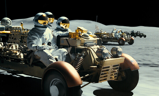 Roy must travel to an intermediate station on the Moon, and from there to a base on Mars, where he’s meant to call his father. Along the way, Gray engages in detailed world-building that immerses the viewer in a distinct, though faintly familiar, future-world. The practical reality of the story takes place in a believable science-fiction setting, filled with intricate details overseen by production designer Kevin Thompson. When Roy lands at his first stop on the journey, the city on the lunar surface, it looks just like what capitalistic human beings would build: an airport concourse, complete with chain restaurants and corporate logos (Applebee’s on the Moon, anyone?). In this embrace of genre, Gray has also conceived several thrilling, episodic set-pieces that make excellent use of superior CGI and visual design. At one point, Roy, escorted by Colonel Pruitt (Donald Sutherland), a friend of his father, finds himself in a breathless lunar buggy battle, something like Mad Max on the Moon—which has become a feudal state of renegade factions. Later, the station on Mars looks like wasted concrete space reminiscent of the post-nuclear structures in Andrei Tarkovsky’s Stalker (1979), whereas the cold and flat interiors, accented by vintage birdcages and dolls, recall the visual blend of new and old in Tarkovsky’s Solaris (1972).
