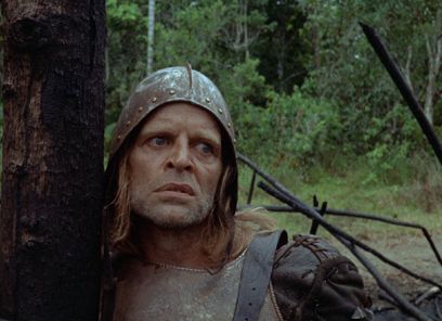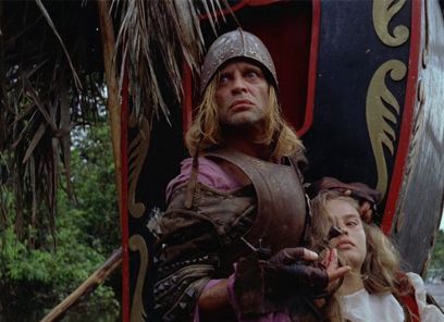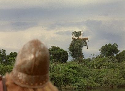 Elsewhere, his film operates in a purely hallucinatory state. Herzog shows us impossible things, and we can never quite know if they are real. At one point, a man is counting to ten. Behind him, another man swings a sword and decapitates him. The head, which rolls several feet away, finishes its thought: “Ten.” Then there’s a haunting moment when Ursúa’s wife, who wears a blue dress throughout, appears wraithlike in a white and gold gown, then disappears into the rain forest. Has she died, leaving her spirit to walk into the forest? Has she merely given up and resolved to submit herself as a meal to the cannibalistic natives who inhabit the jungle? Another nightmare moment in the film occurs when, as his raft descends the river, Aguirre’s men see a boat high in a tree. The moment is eerie, as water levels could never have lifted a boat up there. We can only wonder if it fell from the sky, or if some creature from inside the rain forest lifted it up and dropped it. Herzog executed the moment by building a real boat in the tree, assembling it in five sections and using an elaborate scaffold around the tree. The effect and implementation anticipate Herzog’s otherworldly uses for a boat in Fitzcarraldo. Finally, a slave aboard the raft remarks that the boat is not real, and that the forest is not real. And then a native’s arrow strikes him in the leg. He does not react; rather, he says the arrow is not real either.