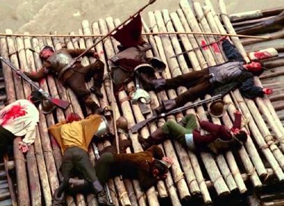 The lasting effect of Aguirre, the Wrath of God over other Herzog films is accomplished by how completely the director immerses his audience into a fever dream. Watching the film is a surreal experience that embraces the unreal. Listen to the transfixing music by German electronic band Popol Vuh, who scored half a dozen Herzog films through The Enigma of Kaspar Hauser in the coming years. They use a choir organ to create an unnerving, apostolic temperament to scenes as if something profound and horrifying is taking place before our eyes, yet deserves our reverence. Herzog wanted to implant a sense of dreamlike unease throughout the film, largely directed toward the jungle’s mystique. He sought to create a jungle that was “so strange you just cannot trust it.” He also included an audio track of jungle bird sounds in the background, and after a time it becomes almost white noise, except when he removes it and leaves the audience with only a frightening silence—which means local tribes have surrounded the Spanish. Nowhere is safe. On the rafts, Aguirre’s crew finds dead bodies, as arrows were shot in silence from somewhere deep in the forest. On land, cannibal camps have human remains strung up as decoration, whereas in the forest, traps lift victims into the branches, leaving only blood to drop onto the leaves below. In its wild condition, the jungle is both merciless and beautiful.
