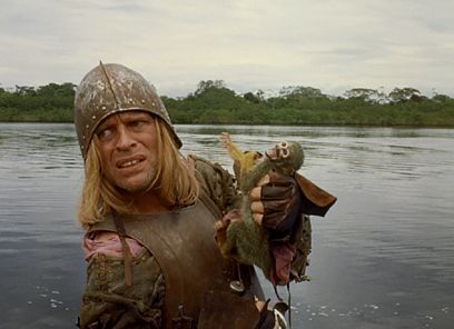 Herzog’s drive for authenticity put his actors’ lives at risk. During pre-production, he scouted locations for the rapids sequence and found what he believed was a relatively safe section of the river. When he tested it, his cheap raft “split in two and disintegrated, and one-half got caught in a whirlpool.” When filming the actual rapids scene, he had the local natives build a stronger raft that would survive the journey downriver. His actors boarded the raft and were set to ride the rapids. The shot had to be captured in one take because of the danger, and everyone except Mauch, who had to maneuver around the raft to capture various angles, was tethered for their own safety. When the raft ended up in the whirlpool, the actors had to be dragged through the river with ropes to escape. Elsewhere, Herzog put himself at risk. To accomplish the final shots aboard Aguirre’s doomed raft, which is infested by monkeys the way some ships are infested with rats, the director hired a local to gather hundreds of monkeys. When they began filming, the monkeys attacked. While Kinski interacted with the monkeys on film, at the same time Herzog and others off-camera were forced to endure the monkey attacks in silence to preserve the shot. Under the surface of such moments is a darker truth: Halfway into the shoot, the existing footage that was shipped to Mexico to be processed was reported lost. At this news, Herzog had no reason to continue filming; he could not possibly finish on his remaining budget, nor could he continue shooting and finish the film without the processed footage. But he continued anyway, feeling that if he stopped now the cast and crew would feel their trials were for nothing. Fortunately, some weeks later, the footage was found in a customs office in Lima, Peru, never having left the airport for Mexico. But the notion that Herzog continued filming anyway, putting his cast and crew through hell despite being under the impression that his efforts were pointless, further aligns the director with his film’s subject.