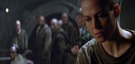 The basic motivations of the creature (designed as a quadruped by original alien artist H.R. Giger and realized by effects artists Tom Woodruff, Jr. and Alec Gills) remain peculiar. Rather than collecting and cocooning its victims as the creature does in the earlier films, this one kills unsparingly, seemingly without purpose, like a masked murderer in a slasher movie. In previous Alien films, when a victim is taken, the victim’s fate is worse than death; they become a host for an alien. But there’s no immediate threat of the species spreading here, save for the alien embryo Ripley discovers gestating inside her. Worse, it’s a Queen, capable of laying eggs and creating countless more. Except, the threat of this on Fury 161 is nil, as the Dog Alien kills every inmate it sight without reservation. Only Ripley is immune to the Dog Alien’s hostility. Moreover, she’s tired of being afraid of the creature, and she wants the alien to kill her and the Queen inside her. But the Dog Alien seems to know there’s a Queen inside Ripley and resists killing her. Even so, the alien has left no potential hosts for its Queen. (NOTE: This poor conflict could have been assisted by a dramatic turn if, say, the Dog Alien had begun to build a nest for its inevitable Queen and stored the prisoners as future hosts. Why? the characters would ask throughout the film, until the big reveal when we learn of the embryo Ripley carries inside her.)