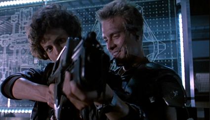 For his ensemble of Colonial Marines, Cameron cast several members of his veritable stock company, all capable of the larger-than-life personalities assigned to them. The inexperienced Lieutenant Gorman (William Hope) puts on airs and old hand Sergeant Apone (Al Matthews) barks orders like a drill instructor. Privates Vasquez (Jenette Goldstein, who later appeared in Terminator 2: Judgment Day) and Hudson (Bill Paxton, who worked with Cameron on several Corman flicks and appeared in The Terminator as a punk thug) could not be more different, she a resolute “tough hombre” and he an all-talk badass who turns into a sniveling defeatist when the pressure is on (“Game over, man!”). Ripley is weary of the android Bishop (Lance Henriksen, who starred in Cameron’s first two directorial efforts), but the innocent, childlike gloss in his eyes never betrays its promise. For Corporal Hicks, Ripley’s pseudo-love interest and the Marine who takes charge when the rest are gone, Cameron originally cast James Remar, but personality conflicts led Cameron to recast. Michael Biehn took over, having just starred as the hero of The Terminator, and filled the character with a quiet heroism and dependability. As the story’s strain intensifies, Cameron never forgets to enlarge his characters through their reactions; by the end, not one of them feels one-dimensional or forgotten during the director’s writing process, the effect not unlike great Vietnam War movies of the preceding years (Apocalypse Now, Full Metal Jacket, Platoon, etc.).