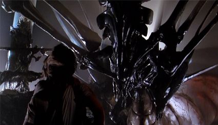 Until the final thirty minutes of Aliens, the creatures, now dubbed “xenomorphs” (a name derived from the director’s boyhood short, Xenogenesis), seem almost circumstantial. In a final assault, their swarms have reduced the human crew down to Ripley, Hicks, and Bishop, and they have captured Newt for cocooning. Ripley must search for her alone, and after she rips the child from a prison of spindly webbing, she rushes headlong into the egg-strewn lair of the Queen, an immense creature excreting eggs from its oozing ovipositor. In Cameron’s hands, the xenomorph becomes more than a “pure” killing machine, but now a problem-solving species with clear motivations within a larger hive and analogous family values. Cameron underlines the family theme in both human and alien terms during an exchange of threats between the two jealous mothers to protect their offspring, Ripley with her proxy Newt wrapped around her torso and the Queen guarding her eggs. This tense moment of horrific calm bursts into Ripley raging as she opens fire on the Queen’s unfolding pods, then flees chase with the gigantic monster close behind to a breathless rescue by the Bishop-piloted dropship. The idea of motherly protection and retaliation comes to a glorious head aboard the Sulaco, when the Queen emerges from the dropship’s landing gear compartment only to face a Powerloader-suited Ripley, who snarls her iconic battle call, “Get away from her, you bitch!”