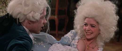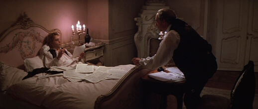 Of course, the music of Amadeus, nearly all Mozart’s and performed by England’s Academy of St. Martin in the Fields conducted by Sir Neville Marriner, raises the production, adding grandiosity to the drama and in turn enhancing the film into—in same cases literally—operatic realms. Several scenes are filled by on-stage performances in which diegetic music drives the moment. Most ingenious is how Forman and Shaffer carefully place Mozart’s music in non-diegetic ways to accompany scenes, selecting compositions to define not only a moment within the film’s dramatic structure but also to exhibit Mozart’s genius. When considering the alternative, such as an original motion picture score, there was no choice at all, really. The subject gives way to some of the best music ever written, and to not use that would be nothing short of foolish. At the 1985 Oscar ceremony, when Maurice Jarre won for A Passage to India, he quipped at how lucky he was that the music of Amadeus, not being an original score, could not be nominated.