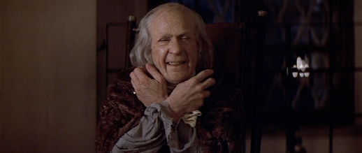 Just as Salieri’s view of himself is mutated, his reasoning of God’s desires range from tragic to disturbing, as shown on the young priest’s face. Played by Richard Frank, Father Vogler is Salieri’s sole audience member and listens as the raconteur weaves a sort of warped logic out of his misfortunes, all of which he blames on God. Mozart’s death gives way to the most powerful scene in Amadeus, which finds the composer suffering from exhaustion on his deathbed, and Salieri, who has tricked Mozart into writing a “death mass” so that he might steal it for himself and play it at Mozart’s funeral, offering to take dictation. As the story progresses, at times Vogler appears understanding and even enthralled by Salieri’s account; others, Salieri’s tale becomes unfortunate or tragic because, as Vogler’s face tells us, he believes so wholeheartedly that God controls all, that when his life goes awry, God becomes an unforgivable monster, cruel and mocking to such extremes that not even Vogler can defend. Vogler appears devastated and speechless in the final scenes, perhaps out of shock over Salieri’s murderous actions, perhaps from the misfortune that piety has brought forth. Faith has driven Salieri mad.