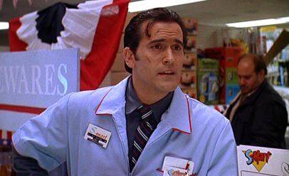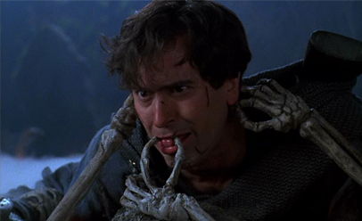 Picking up where its predecessor Evil Dead 2 (1987) left off, Army of Darkness begins when Campbell’s chainsaw-armed S-Mart employee and Deadite-killer Ash is sucked through a time vortex and lands in 1300 AD, only to find himself shackled in the court of Arthur (Marcus Gilbert). At first believed to be an ally of Arthur’s opponent Duke Henry the Red (Richard Grove), a Wiseman (Ian Abercrombie) suggests Ash may be the “Chosen One” foretold to protect their people from the Deadite scourge. Proving his salt, Ash goes on a quest to retrieve the Necronomicon—a book containing the incantations needed not only to send Ash back to his time but to stop the Deadites. During his journey, Ash is confronted by an evil Deadite force that gets inside him to create a doppelganger, a twin called Evil Ash (also Campbell). After quickly disposing of his twin, Good Ash botches up the special words that must be said when obtaining the Necronomicon, and he inadvertently releases the Deadite evil. Unearthed is the titular army led by none other than the zombified Evil Ash, who marches on Arthur’s castle in a climactic battle. Seemingly victorious over evil, Good Ash is sent back to his own time to the Housewares department of S-Mart, where he’s suddenly attacked by a lone Deadite. He kills the thing, claims a somewhat random doting female onlooker for a kiss, and the film ends with our hero boasting.
