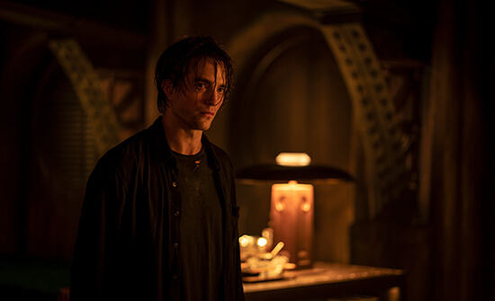 Playing the seventh iteration of Batman onscreen, not counting animated features, Pattinson looks convincing in his functional, mobile costume. The few times Pattinson appears out of costume, he’s with Alfred (Andy Serkis), who helps Batman decipher Riddler’s puzzles and offers an underdeveloped father-figure role. Unfortunately, most of the characters in The Batman feel overshadowed by Reeves’ vast and immersive plotting. Kravitz’s role contains fewer catlike hot-and-cold moments that would build a femme fatale persona than one might expect. She rarely seems as though she will turn on Batman except to defy him to pursue her ambition (but their dual motorcycles make them awfully cute together). Pattinson’s Batman, too, feels singularly motivated and emotionally restrained, save for his few scenes with Serkis. Among the supporting roles, Peter Sarsgaard has a memorable turn as Gotham’s district attorney. But Farrell’s casting proves the strangest—he’s under so much convincing makeup that it’s anyone’s guess why another actor wasn’t cast. Still, he’s terrific in the role, regardless of the studio demanding that he lose the signature cigarette holder. The standout is Dano, who’s wholly unhinged as Riddler, a wackjob that feels like an unholy union between the actor’s roles in There Will Be Blood (2007) and Prisoners (2013). Although much of his performance in the first two hours occurs behind an impenetrable mask, his heavy breathing and octave-defying voice do plenty to unnerve. Much later, his unmasked scenes reveal the creepy, chilling, psychopathic face underneath.