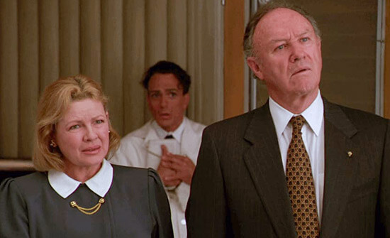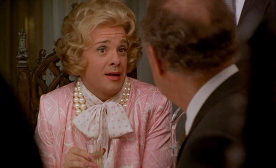 Indeed, May’s witty screenplay shreds the Keeleys, who represent the “normal” right-wing position. True to May’s brand of comedy, she takes aim at WASPs and portrays them as absurd, hypocritical characters. Senator Kevin Keeley (Gene Hackman), the Christian-valued co-founder of the “Coalition for Moral Order” committee, believes that Billy Graham is too liberal and treats his wife Louise (Dianne Wiest) like a doormat. With an election looming, The Senator faces a scandal when his trusted colleague and committee co-founder dies in bed with “an underage black whore.” But he sees his daughter’s wedding as an opportunity to counteract the negative press and reinforce his position on family values. And so, Barbara feels she has no choice but to lie when her father asks about Val’s parents, hiding not only that they are gay men but also Jewish—requiring Armand and Albert to adopt the persona of straight, god-fearing Americans who take the name “Coldman” (“the ‘d’ is silent”). May’s barbed treatment of Senator Keeley comes in subtle jabs, including an overindulgence of sweets and a self-obsession that includes watching his own appearance on a right-wing talk show—reminiscent of The McGlaughlin Group, complete with pundits shouting over each other (“It’s the most intelligent show on television,” he insists). Other jabs are not so subtle, ranging from racism to American exceptionalism, besides the obvious homophobia. At the eventual dinner party, the Keeleys refer to Agador as a “beige savage,” condemn Armand’s “European snobbery,” and soapbox against gays in the military. Later, when the Senator is drawn to Albert’s caricature of a conservative woman (who preaches that “if you stop the doctors, you stop the abortions”), May seems to say that only an absurd person could take an outlandish caricature seriously.