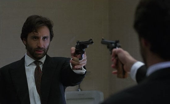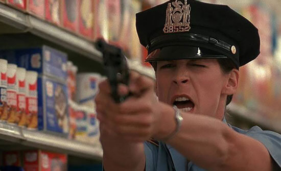 Unquestionably, Blue Steel bears many characteristics associated with Bigelow’s brand of cinema. Like her previous film, the superb Near Dark (1987), which blends noirish visuals and Western iconography with postmodern vampires, the director rethinks established genres with an eye toward masculine archetypes and feminist critique. Her interest in themes of gender, violence, and rape would again emerge in her masterful Strange Days (1995)—another film whose villain, like Eugene, wants his victims to witness their own pain and demise from an outside perspective. Additionally, Bigelow presents Turner as an alternative to standard masculine power, just as the opening title sequence reflects the handgun’s intersexual construction of both external and internal components. But the hero isn’t merely a woman in a man’s role, such as Sigourney Weaver’s so-called “Rambolina” as Ellen Ripley in the Alien franchise. Turner becomes more than the “phallic feminine” in Bigelow’s hands, albeit in a way that complicates her character in unsatisfying ways from a dramatic perspective.