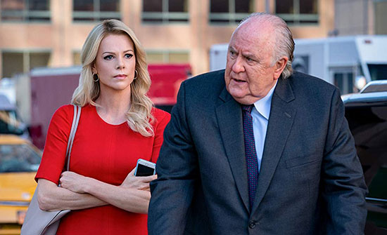 Indeed, the first time you see Charlize Theron in full makeup as Megyn Kelly, her appearance and the perfect recreation of Kelly’s low, commanding tone of voice require the viewer to acclimate. It’s the sort of change that isn’t apparent at first glance. You will wonder if Theron has been enhanced with CGI, similar to the effects used on Robert De Niro and Joe Pesci in The Irishman this year. After a minute or two, you come to realize that some fake eyelashes, a heavy dose of dark eye makeup, and a haircut do the trick, making Theron disappear into another chameleon performance. The result is aided by makeup artist Kazuhiro Tsuji, who won an Oscar in 2018 for transforming Gary Oldman into Winston Churchill for Darkest Hour. The makeup used to render Kidman into Carlson is less successful, whereas Ailes has the look of John Lithgow in a fat suit. Regardless of surfaces, each of the performances is memorable.