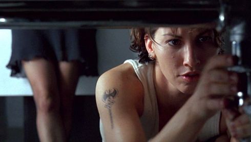 Tilly’s breathy, baby-talk voice served her well in Woody Allen’s Bullets Over Broadway (1994), where she earned an Oscar nomination in another role as a mobster’s girl. But she turns her signature sound into an almost Kathleen Turner-esque level of sultriness here. She’s incredibly convincing as a femme fatale, but it’s even more charming that the Wachowskis allow Violet and Corky to emerge from the film’s tense ordeal with a bag full of cash and no one to suspect them. Whereas Violet uses her sexuality as a weapon against men—Violet uses heterosexuality as a disguise—her only genuine affections are for Corky. Because we are familiar with the conventions of film noir, we cannot help but suspect Violet throughout. That she never double-crosses Corky is less a disappointment or failure to realize the character’s potential than a romantic jolt. This is where Bound becomes more than just a thriller, or a film that would exploit its lesbian characters; rather, it’s a sordid and violent love story. The Wachowskis present Corky as a strong woman who has been wounded by other women in the past, and rather than play out her repetitive and ill-fated lot, as so many film noir protagonists have, she finds true love. It’s a happy ending after all, where Tom Jones’ “She’s a Lady” blares on the soundtrack to comic, quirkily romantic effect.